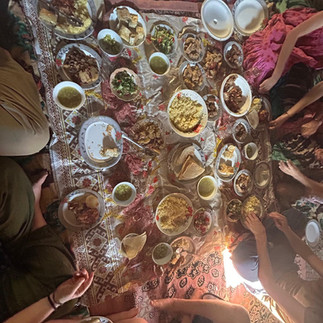 I visited a house of a woman in the village where my keen eyes trained by another land tried their very best to convince me was poor. The house did not posses running water or glass pains for the windows. No bed on the floor, no couches or chairs. Just rugs covering an earthen floor in a house made of salt and mud and stone along time ago. Rabbits graced her outhouse scampering all over her floors burrowing under her foundation. Goats and sheep and chickens lived in an enclosure attached to the house. Soft light pours in along with feral cats looking for bones. An old plastic table cloth was spread on the floor. No furniture or table just a few pillows to sit on.